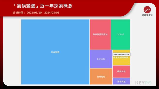 透过《KEYPO大数据关键引擎》舆情分析系统调查,在「气候变迁」近一年的网路探索概念中可以看见,台湾为此研拟的「气候变迁因应法」、「国家气候变迁调适行动计画」,以及第28届联合国气候变化大会「COP28」都受到关注,讨论热烈的相关议题包含了「全球暖化」、「极端气候」、「净零排放」等,这些也包含在这次的气候变迁报告中。