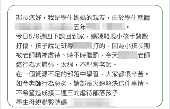 陈情内容指出,该名学生5月9日放学后被妈妈发现手臂都是伤,孩子说是被导师打的,小孩长期被导师精神虐待、体罚,导师的行为太夸张、不配为师,希望部长火速解决此事,希望不要造成接二连三虐待孩子。