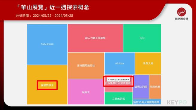 透过《KEYPO大数据关键引擎》舆情分析系统可以看见,在「华山展览」近一周的网路探索概念中就出现了「我推的孩子」及「日本集英社沉浸式漫画光影展」,显见许多人都非常期待这场展览,消息一公布就在网路上引发许多讨论。《我推的孩子》动画版第2季将在7月上映,官方近期释出主视觉图及宣传影片,配合动画第2季的话题度,将于6月底现身华山的光影展也引来更多关注。