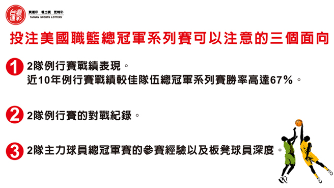 NBA现在进入1年1度最紧张刺激的总冠军赛,大家可以好好把握本季最后可以投注的机会,除了单场、过关及场中投注外,享受「买运彩 看比赛 更精彩」的乐趣,也祝大家幸运中大奖。