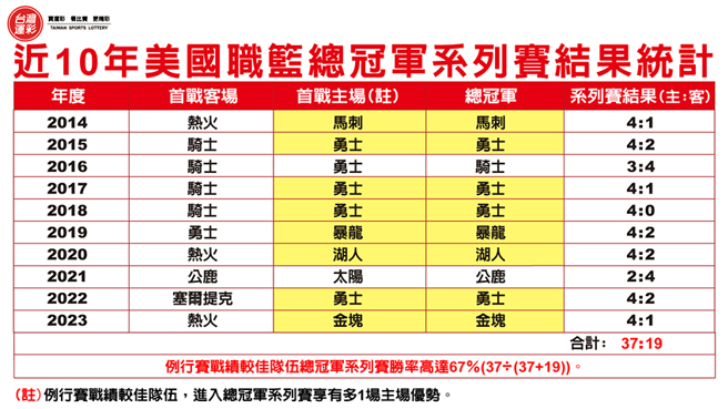 统计近10年NBA总冠军系列赛的结果来看,NBA例行赛胜率高的队伍「4:0」1次、「4:1」3次、「4:2」4次、「3:4」1次以及「2:4」1次,合计为37: 19,胜率为67%,另外2队例行赛的对战纪录、2队主力球员总冠军赛的参赛经验以及板凳球员深度等,也是大家投注总冠军时的重要参考。
