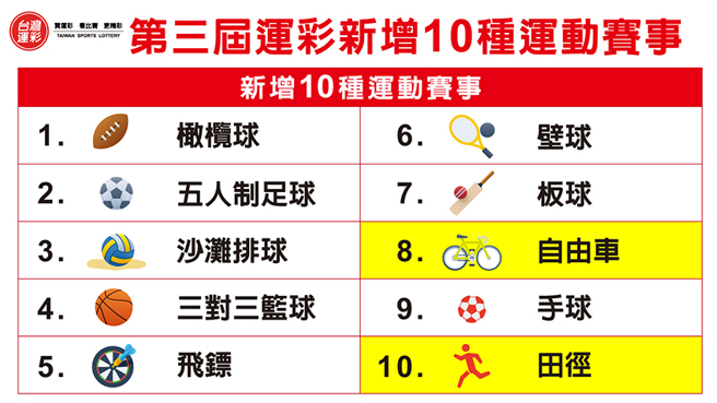 第三届运彩2024全新上市产品更丰富,除原本的16种运动继续提供投注外,又再新增10种运动赛事,先前已跟大家介绍橄榄球、五人制足球、三对三篮球、沙滩排球、壁球、板球、手球等7种,今天再来跟大家介绍2种,那就是「自由车」及「田径」。