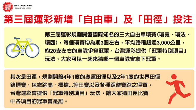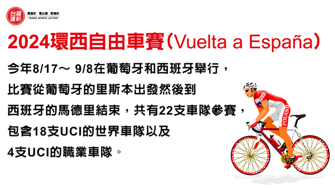 首先是「自由车」,第三届运彩规划开盘国际知名的三大自由车环赛,每个环赛均为期3周左右,平均路程超过3,000公里,20支左右的车队争夺冠军,台湾运彩提供冠军特别项目玩法,让大家猜哪一个车队会拿下冠军。其中环义(Giro d’Italia,每年5-6月)及环法(Le Tour de France,每年7月)都已经开盘、完赛与派彩,紧接着要开盘的是8月中进行的环西(Vuelta a España,每年8-9月),今年8/17~ 9/8在葡萄牙和西班牙举行, 比赛从葡萄牙的里斯本出发然后到西班牙的马德里结束,共有22支车队参赛,包含18支UCI的世界车队以及4支UCI的职业车队,大家可以买张运彩预测一下会是哪个车队获得冠军。