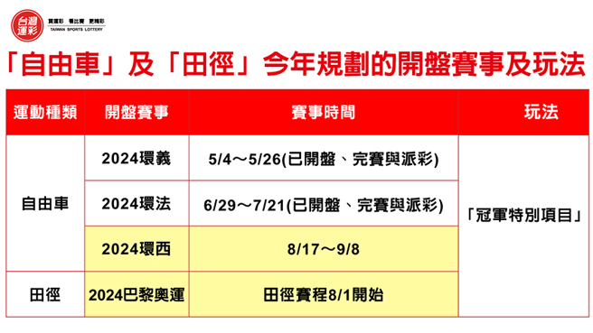 喜欢自由车及田径的朋友们可以关注8/17开始的环西自由车赛以及8/1开始的巴黎奥运田径项目,运彩都规划提供冠军特别项目的投注,欢迎大家可以来买张运彩猜一猜,验证一下自己的眼光,还有机会抱回奖金。