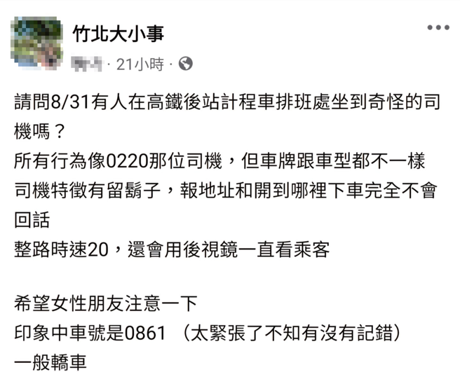 另一名女网友则在「竹北大小事」发文表示,8月31日在高铁后站也疑似遇到这辆计程车,全程不理人,整路时速20公里,还会一直透过后照镜盯着乘客,行为与之前爆料的运匠特徵几乎都一致,但车牌、车型都不一样,呼吁女性朋友注意。
