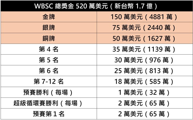 中华队晋级4强,保证35万美元奖金,预赛3胜再加3万美元(还有对古巴之战),复赛拿到1胜就突破40万美元(新台币1301万),规定必须有半数以上的奖金要平分给球员。