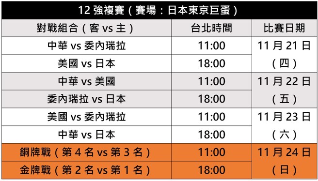 中华队预赛打出4胜1负的超强成绩,将在东京巨蛋的复赛「压轴赛」对决地主日本。官方公布确定的对战组合与赛程,中华队3场比赛都是客队(先攻的一方),也就是稍微吃亏一点,对手依序是委内瑞拉、美国、日本。