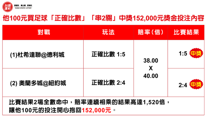 6/28桃园有位购券者买运彩时挑了2场足球赛事的「正确比数」,并且买2关来提高中奖的金额,分别是1.「杜希达联@德利城 正确比数 1:5 赔率38倍」串2.「奥兰多城@纽约城 正确比数 2:4 赔率40倍」比赛结果2场全数命中,赔率连续相乘的结果高达1,520倍,让他100元的投注开心中奖152,000元。