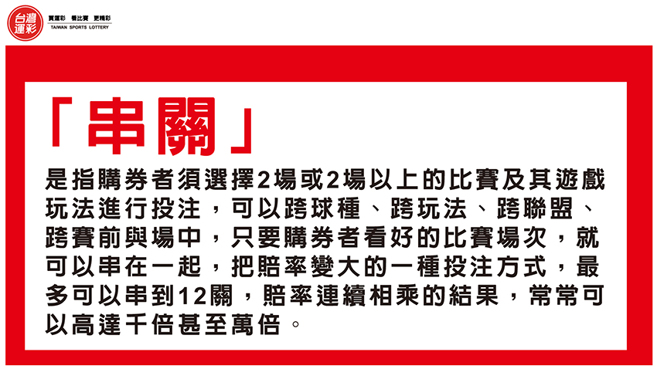 运彩「串关」是指购券者须选择2场或2场以上的比赛及其游戏玩法进行投注,可以跨球种、跨玩法、跨联盟、跨赛前与场中,只要购券者看好的比赛场次,就可以串在一起,把赔率变大的一种投注方式,最多可以串到12关,赔率连续相乘的结果,常常可以高达千倍甚至万倍。