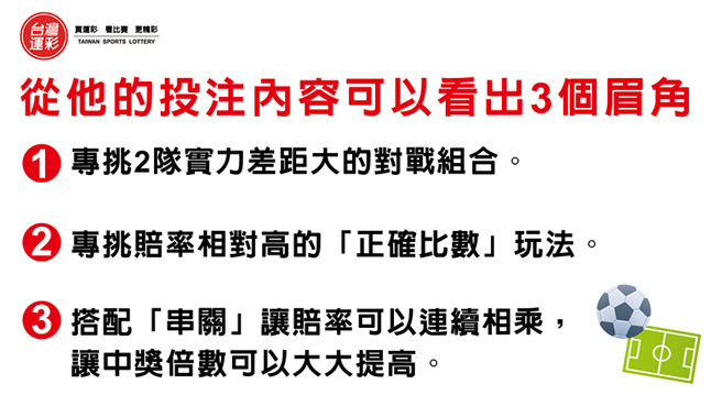从他的投注内容可以看出3个眉角:1.专挑2队实力差距大的对战组合。2.专挑赔率相对高的「正确比数」玩法。3.搭配「串关」让赔率可以连续相乘,让中奖倍数可以大大提高。提供大家投注参考,希望下一个过关中大奖的人就会是你。
