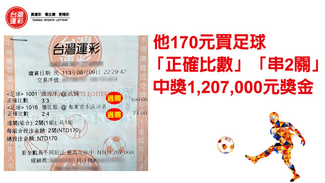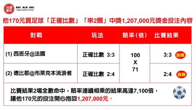8/9台北市的投注站有位购券者买运彩时挑了2场足球赛事的「正确比数」,并且买串2关来提高中奖的金额,分别是1. 赔率100倍的「西班牙@法国 正确比数 3:3」串2. 赔率71倍的「徳比郡@布莱克本流浪者 正确比数 2:4」,比赛结果2场「正确比数」全数命中,串关赔率连续相乘的结果高达7,100倍,让他170元的投注开心中奖1,207,000元。