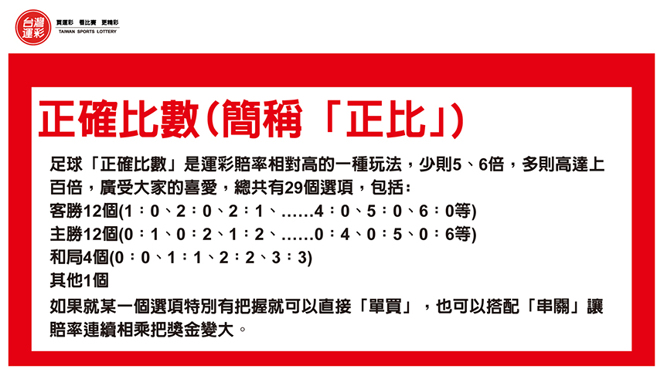 足球「正确比数」是运彩赔率相对高的一种玩法,少则5、6倍,多则高达上百倍,广受大家的喜爱,总共有29个选项,包括客胜12个、主胜12个、和局4个以及其他1个,如果就某一个选项特别有把握就可以直接「单买」,也可以搭配「串关」让赔率连续相乘把奖金变大。