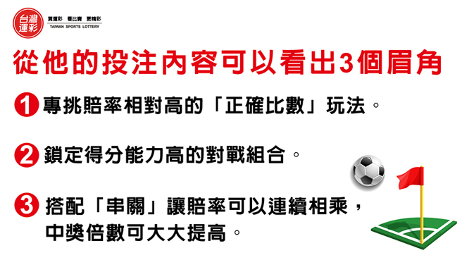 从他的投注内容可以看出3个眉角:1.专挑赔率相对高的「正确比数」玩法。2.锁定得分能力高的对战组合。3.搭配「串关」让赔率可以连续相乘,中奖倍数大大提高。提供大家投注参考,希望下一个过关中大奖的人就是你。