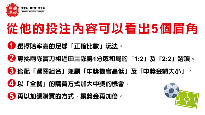 从他的投注内容可以看出5个眉角:1.选择赔率高的足球「正确比数」玩法。2.专挑两队实力相近由主队胜1分或和局的「1:2」及「2:2」选项。3.搭配「过关组合」兼顾「中奖机会高低」及「中奖金额大小」。4. 以「全餐」的购买方式加大中奖的机会 5. 再以加码购买的方式,让奖金再加倍。。提供大家投注参考,希望下一个过关中大奖的人会是你。