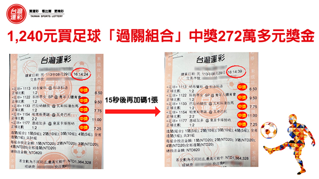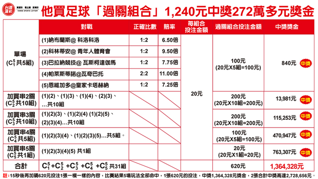8/29台中清水投注站有位购券者挑5场足球赛事以「过关组合」「全餐」的方式投注,投注的内容为1.赔率6.50倍的「纳布兰斯@科洛科洛 正确比数1:2」、2.赔率9.50倍的「科林蒂安@青年人体育会 正确比数1:2」、3.赔率7.75倍的「巴拉纳竞技@瓦斯柯达伽马 正确比数1:2」、4.赔率11.00倍的「帕莱斯蒂诺@瓦奇巴托 正确比数2:2」以及5.赔率7.25倍的「恩维加多@皇家卡塔赫纳 正确比数1:2」,买「过1关」(C5取1)有5个组合、买「过2关」(C5取2)有10个组合、买「过3关」(C5取3)有10个组合、买「过4关」(C5取4)有5个组合以及买「过5关」(C5取5)有1个组合,「全餐」共31个组合,每组合买20元,合计投注620元,15秒后再加码620元投注1张一模一样的内容,比赛结果5场玩法全部命中,1张620元的投注,中奖1,364,328元奖金,2张合计中奖高达2,728,656元,羡煞不少人。
