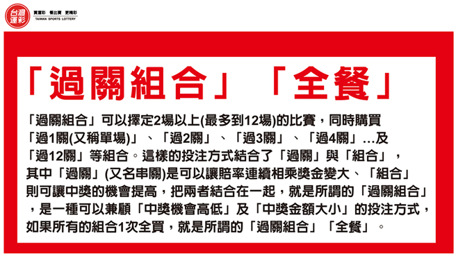 「过关组合」可以择定2场以上(最多到12场)的比赛,同时购买「过1关(又称单场)」、「过2关」、「过3关」、「过4关」…及「过12关」等组合。这样的投注方式结合了「过关」与「组合」,其中「过关」(又名串关)是可以让赔率连续相乘奖金变大、「组合」则可让中奖的机会提高,把两者结合在一起,就是所谓的「过关组合」,是一种可以兼顾「中奖机会高低」及「中奖金额大小」的投注方式,如果所有的组合1次全买,就是所谓的「过关组合」「全餐」。