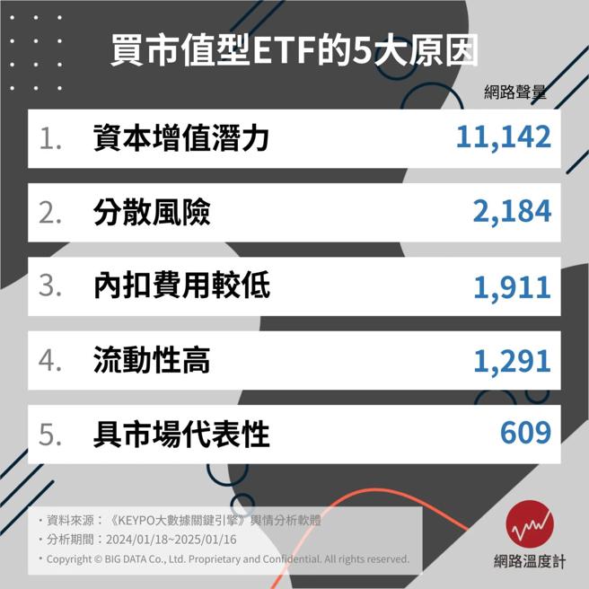 进一步透过《KEYPO大数据关键引擎》舆情分析软体,揭晓近一年(2024/01/18~2025/01/16)探讨「买市值型ETF」的5大原因。市值型ETF因其增值潜力而备受青睐,核心概念是「追求最佳报酬=市值型」,因为整体股票市场市值长期呈现向上趋势,对于追求稳健长期投资的投资人来说,是一个理想的选择。
