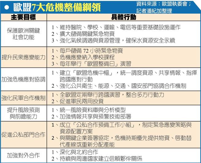 欧盟执委会26日根据《欧盟整备联盟战略》(EU Preparedness Union Strategy)公布《7大危机整备纲领》,寻求从战略层面推广应变机制,透过强化全社会层面参与、资源整合,在危机发生时,加强维繫关键社会功能运作与整体稳定。副总统萧美琴昨日表示,这代表着不只臺湾,强化全社会防卫韧性,此刻正是主要先进国家最重要的议题之一。