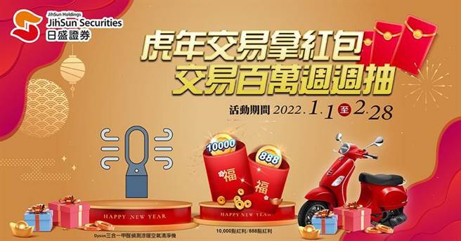 為抓住台美股投資熱潮,日盛證券深耕海內外市場客群,結合台股、海外股票與海外債券交易,自1月1日至2月28日舉辦「虎年交易拿紅包,交易百萬週週抽」活動,投資人只要在活動期間符合交易門檻,就有機會抽中Vespa機車、Dyson涼暖空氣清淨機、Samsung Galaxy等24個獎項、總價值高達60萬的獎品,詳細活動內容可至日盛證券網站查詢。