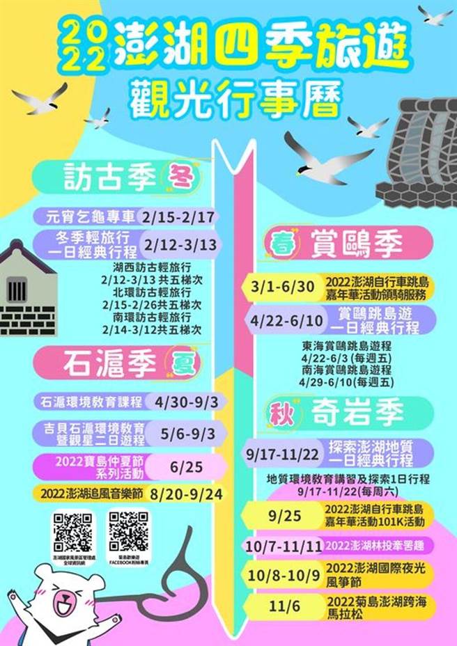 澎湖底蘊多元豐厚,得以奠立永續經營根基及拓展客源深植澎湖旅遊印象,澎管處將力推澎湖四季旅遊,推廣主軸分別為:春之賞鷗季、夏之石滬季、秋之奇岩季及冬之訪古季,帶領民眾深入探索澎湖四季不同的面貌,一方面仍持續辦理年度主題觀光活動,如:自行車領騎活動、2022澎湖追風音樂節活動、2022澎湖自行車跳島嘉年華-101K Hopping Bike活動、2022澎湖國際夜光風箏節活動、2022菊島澎湖跨海馬拉松活動等,以資源為本,活動為輔,整合套裝運用,透過澎管處各季主推連續8週每週五或週六之1日經典行程、推薦旅行社包裝3日行程、媒體社群踩線廣宣及異業合作結盟推廣等擴展行銷效益。