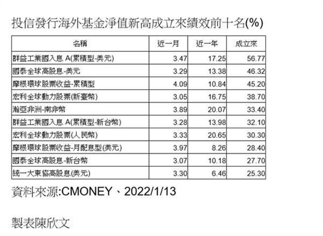 近期在美國升息縮表消息、Omicron疫情以及通膨升溫因素下,全球股市表現震盪,海外基金績效也隨之動盪,不過仍有淨值創下新高的基金,統計投信發行的各類海外股票基金淨值創新高的有13檔,以成立來績效來看,前三名分別是群益工業國入息56.77%、國泰全球高股息46.32%、摩根環球股票收益45.2%,清一色都是高股息基金。