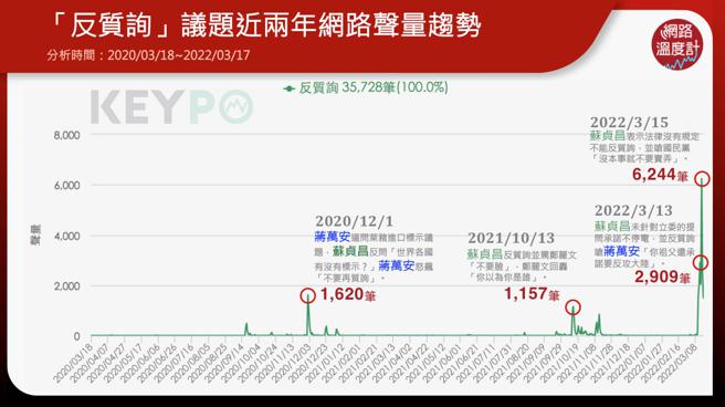 透過《KEYPO大數據關鍵引擎》統計調查(2020/03/18~2022/03/17),近兩年來網路上對「反質詢」議題,聲量最高峰為2022年3月15日,討論度達6,244筆。針對國民黨立法院黨團,不滿行政院長蘇貞昌及閣員屢次反質詢,行文立法院長游錫堃召開朝野協商主持公道,落實立法院職權行使法,不能反質詢的規定;蘇貞昌在備詢前受訪表示「立法院所訂的法律,從沒有說不能『反質詢』這幾個字」。