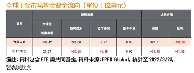 俄烏戰爭持續、油價強漲、通膨隱憂和聯準會官員態度更趨鷹派等不確定因素影響下,全球股市上週漲跌互見,主要股票基金資金動能也隨之輪動。其中以全球型新興市場基金吸金力最強,以24.77億美元的淨流入稱霸股票吸金之冠,也讓先前連三周失血得以止步,歐非中東基金也連兩周獲資金進駐,上周再小幅流入0.9億美元。反觀之前資金動能較強的美股基金、新興亞洲基金和拉丁美洲基金,上周資金動能則明顯受抑,美股基金甚至轉失血31.18億美元,創今年一月中旬以來單周最大賣壓,全年淨流入收歛至992.61億美元。新興亞洲基金和拉丁美洲基金分別轉流出30.58億美元和1.39億美元,連14周和連6周資金淨流入紀錄被迫喊停。至於和俄羅斯有高度貿易依存關係的歐股基金,已連續6周失血,上周再流出11.59億美元,也是主要股票基金中今年來唯一資金淨流出的區域。摩根資產管理環球市場策略師林雅慧指出,俄烏戰爭尚未停歇,又有通膨持續升溫和油價強彈等不確定性來擾亂,導致先前表現相對強勢市場面臨獲利了結壓力,全球股市也跟著各自發展,而在資金面上,區域市場之間也明顯出現輪動,反映近期市場情緒舉棋不定。不過,短線股市已浮現買進訊號浮現,林雅慧表示,根據美國銀行最新調查,3月全球基金經理人的現金水位,不僅來到2020年4月以來的最高水準,甚至高於2008年金融危機期間的5.4%,顯示投資人擔憂俄烏戰爭的不確定性增持現金,對未來經濟前景的看法為2008年金融危機以來最悲觀。依過往經驗,基金經理人現金水位高於5%以上時,為股市在相對低點的買進訊號,目前股市已反映了大部分聯準會升息與烏俄不確定的利空,長期投資價值浮現。富蘭克林證券投顧分析,俄烏戰事持續及部分國家疫情升溫,預期將壓抑全球經濟成長動能、通膨也將維持更高更久時間,聯準會政策立場更加鷹派,美債殖利率彈升至近三年高點,將牽動各類資產評價重新校準,投資人也將從接下來的經濟數據和四月中旬之後登場的企業財報尋找未來前景的蛛絲馬跡,值此景氣、通膨、利率和資產評價調整之際,建議投資人採取多元分散配置掌握輪動機會,核心部位首選美國價值平衡型基金,股市部位首選科技和基礎建設產業型基金,積極者可搭配操作天然資源和黃金產業型基金。另外,相較於過去的聯準會升息循環,目前新興市場具備較低的通膨水準和較佳的經常帳狀況,再加上許多新興國家已積極升息來對抗通膨,預期新興市場這次將能經受住美國緊縮政策的影響,而面臨大陸疫情再起的挑戰,市場預期大陸政府有望採取寬鬆政策來提振經濟,建議投資人亦可留意新興亞洲股票型基金的投資機會。
