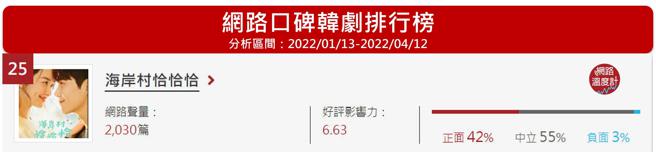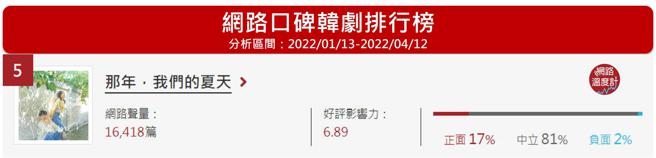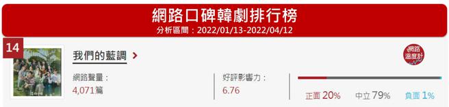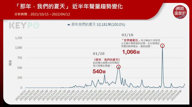 分析區間:本文分析時間範圍為2022年01月13日至2022年04月12日。資料來源:《KEYPO大數據關鍵引擎》擁有巨量資料,以人工智慧作語意分析之工具資料蒐集範圍:累積超過10億筆以上的網路數據庫,其內容涵蓋新聞媒體、社群平台、討論區、部落格、地圖評論等網站。研究方法:系統觀測上萬個網站頻道,包括各大新聞頻道、社群平台、討論區及部落格等,針對討論『我們的藍調時光』、『那年,我們的夏天』、『海岸村恰恰恰』相關文本進行分析,調查「網路聲量」(註1)作為本分析依據。*註1 網路聲量:透過『KEYPO大數據關鍵引擎』,計算社群討論及新聞報導提及的文章則數,聲量越高代表討論越熱,能見度越高。