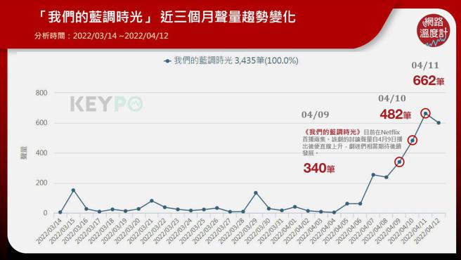 《我們的藍調時光》目前在Netflix首播兩集,第一集就拿下7.3%的高收視率,第二集收視更上升至8.736%,不僅收視成績亮眼,從《KEYPO大數據關鍵引擎》也可以發現,該劇的討論聲量自4月9日播出後便直線上升,在社群論壇掀起討論,不少網友大讚演員演技好、劇情觸動內心,相當期待後續發展。