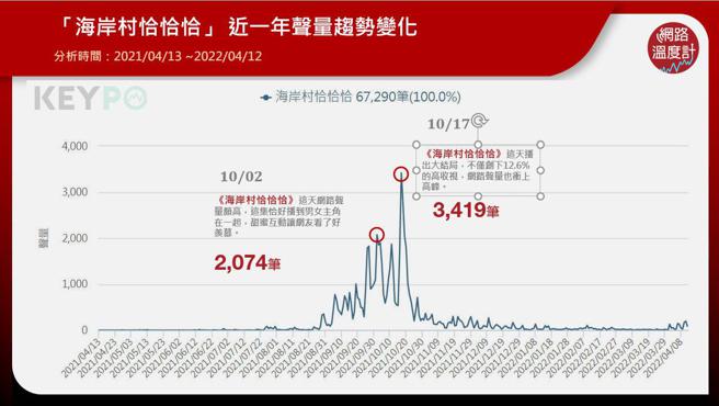 透過《KEYPO大數據關鍵引擎》可以看到,去年10月2日這天網路聲量頗高,有2,074筆,這集恰好播到男女主角在一起,兩人甜蜜又瞞著眾人的搞笑舉動讓網友看了直呼「好甜」。10月17日大結局播出後,不僅創下12.6%的高收視,登上「2021有線台韓劇單集收視」第四名,網路聲量也衝上高峰,話題討論度達3,419筆。