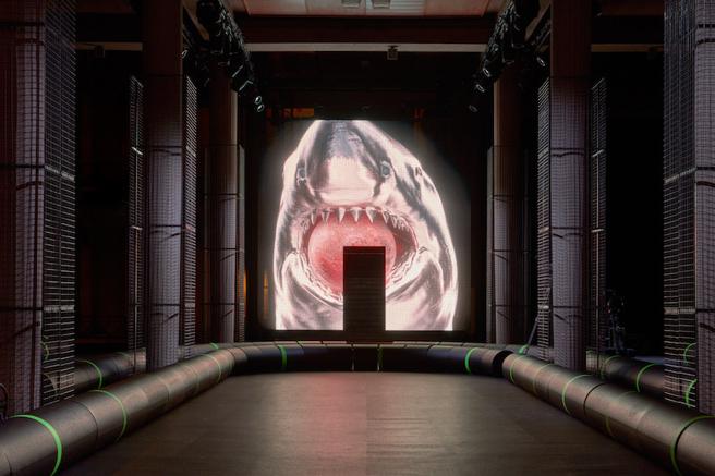 連秀場也以佈置為頗具日常生活的奇異幻想,沙發設計的頗像捲曲的電纜線,接連配合螢幕上出現的鯊魚、花瓣、地球、宇宙,象徵在現世溝通已然無礙,我們可以隨心所欲的獲得想要的資訊。但對於時尚,我們仍舊有太多的未知與太多的可能,Miuccia女士則在這季的Miu Miu裡,為我們打造了另一種全新結果。