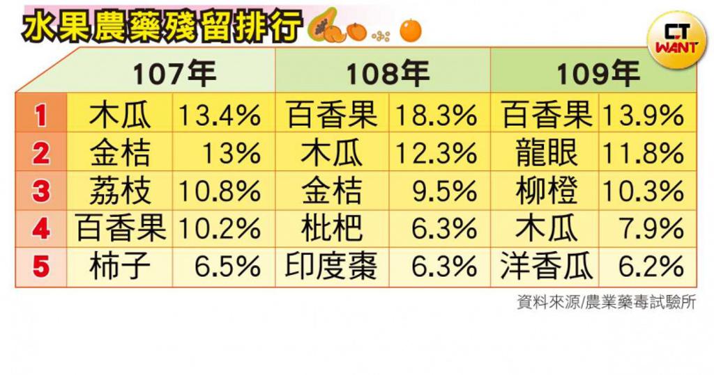 CTWant記者查閱近3年資料,發現百香果連續2年奪下農藥殘留最多水果的冠軍,殘留率分別是108年的18.3%、109年的13.9%,唯一沒奪冠的107年,的則由木瓜拿下第一,農藥殘留率為13.4%,但百香果仍以10.2%的殘留率排名第二。而觀察近3年榜單,也可發現木瓜皆在前5名內,農藥殘留率也相當高。