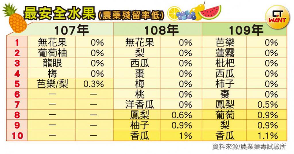 觀察這份「農作物農藥殘留監測」,也有許多水果的農藥殘留率相當低,甚至是0%,例如無花果、西瓜、梅、棗皆連續2年未查驗農藥殘留,不合格率是0%。而國人常吃的芭樂,109年農藥殘留率是0%,107年是0.3%,鳳梨、梨的殘留率也都幾乎在1%以下,安全性算是相當穩定。