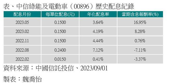 台灣首檔聚焦綠能、電動車雙主題ETF:中信綠能及電動車ETF 1日發布第一階段配息公告,9月18日為除息日,第一階段配息每單位0.33元,若以9月1日收盤價16.14元,單期(季)配息率2.04%,年化配息率衝逾8%。