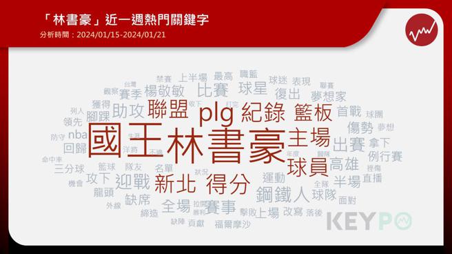 不過林書豪破紀錄的好表現,也讓他近一週熱門關鍵字出現「PLG、聯盟、得分、紀錄」等字,可見這件事成為球迷高度關注的成就。昨(21)日林書豪因傷再掛免戰牌,反觀卡森斯第2戰表現回溫,繳出25分,17籃板,4助攻,4抄截的全能身手,終於展現他NBA等級的好身手,兩位頂級球星在台獻技,讓球迷更加期待未來的賽事。
