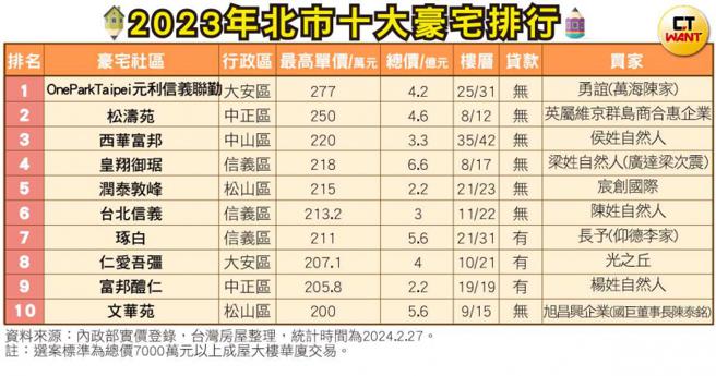 時序進入3月,去年地產交易皆已完整揭露於實價登錄,CTWANT委託台灣房屋以成交單價為基準,彙整2023年北市十大豪宅排行榜,其中信義區有3個社區進榜最多,其餘分散在大安、中正、松山、中山區,進榜豪宅包括「One Park Taipei元利信義聯勤」、「松濤苑」、「皇翔御琚」、「文華苑」等,總價都在4億元以上,且無貸款購入,顯示買家財力驚人。