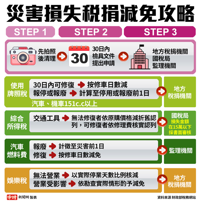 財政部進一步提供所得稅、營業稅、貨物稅、菸酒稅、房屋稅、地價稅、使用牌照稅及娛樂稅等稅目之減免規定(詳「災害損失稅捐減免一覽表」);該部並提醒納稅義務人多加利用財政部稅務入口網(https://www.etax.nat.gov.tw)線上申請稅捐減免。