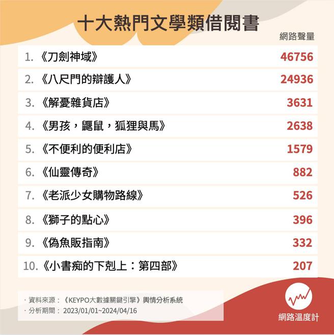 台北市立圖書館先前發表「2023台北閱讀力觀察報告」,其中2023年文學類借閱排行榜由韓國作家金浩然的《不便利的便利店》奪下冠軍,《網路溫度計DailyView》今天透過《KEYPO大數據關鍵引擎》輿情分析系統,統計整理出十大熱門文學類借閱書,除了《刀劍神域》、《不便利的便利店》擁有超高網路討論度以外,你有猜到還有這些書上榜嗎?