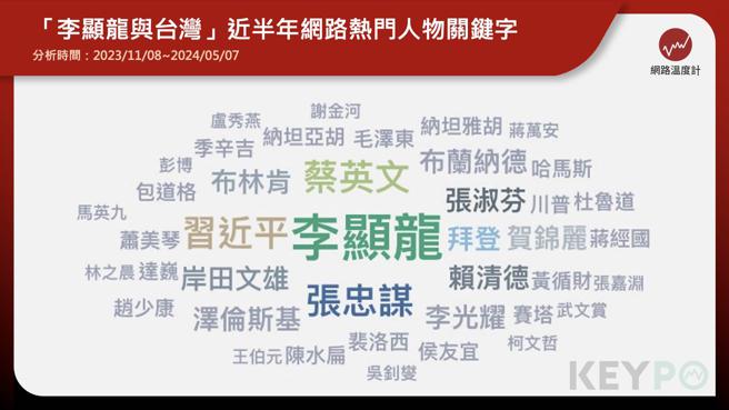 《KEYPO大數據關鍵引擎》輿情分析系統擁有巨量資料,以人工智慧作語意分析之工具資料蒐集範圍:每月處理1000億以上中文資料的網路社群大數據資料庫,其內容涵蓋Facebook、YouTube、新聞媒體、討論區、部落格等網站,針對討論『李顯龍與台灣』相關文本進行分析,調查「熱門關鍵字」(註1)作為本分析依據。