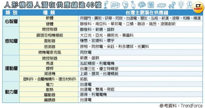 「由於台灣廠商在人型機器人的許多組成環節中已有佈局,隨著人型機器人市場逐步放大,台廠有打入全球供應鏈的機會。」集邦科技研究總監謝雨珊向記者解釋,人型機器人牽涉許多軟體、零組件,從大腦到眼睛、到四肢關節等,分為「心智層」、「感知層」、「運動層」、「動力層」四大部分,各個環節都是商機。