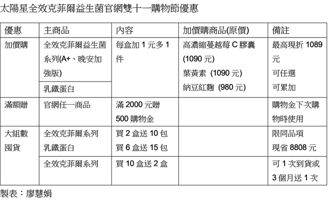 至於雙11特惠方案,第一個方案是「加1元多1件」,太陽星全效克菲爾益生菌系列商品:A+超級食物版、GABA晚安加強版,以及太陽星全效乳鐵蛋白,每買1盒加1元就可獲得1盒官網熱銷商品:高濃縮蔓越莓C膠囊(價值1090元)或葉黃素(價值1090元)或納豆紅麴(價值980元),而且明星系列商品訂購數量不限,加購盒數也可累加。